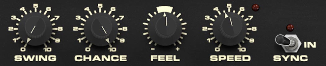 The Feel knob adjusts the timing feel of the arpeggio. This is a more subtle groove control than Swing. While Swing changes the timing relationship between alternating steps, Feel shifts the overall rhythmic vibe, making the pattern feel either more relaxed or more urgent depending on the setting.