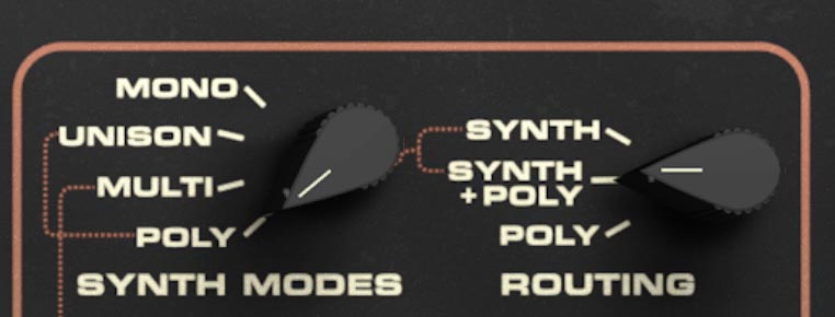 The Routing knob determines which sound engine the arpeggiator controls: Synth, Synth + Poly, or Poly. Be aware that this control is only available when the DS-2 is set to Synth + Poly Mode. If the DS-2 Routing is set to either Synth or Poly, this control is disabled.
