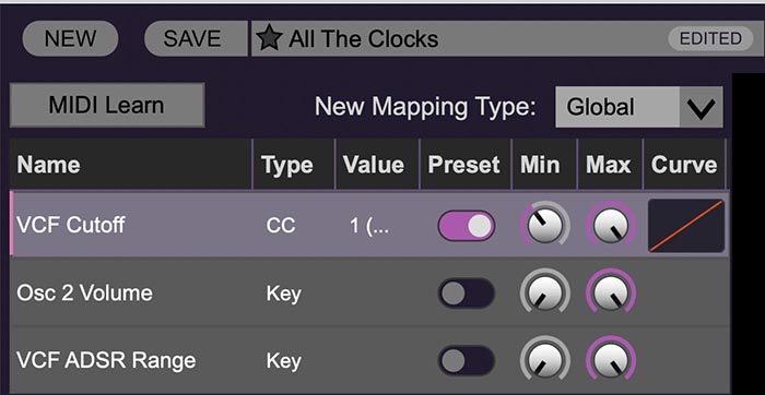 Preset- This slider works in conjunction with the New Mapping Type menu. In the left position (gray background), the MIDI mapping is global (affects all sounds and doesn't change when different presets are selected), in the right position (lavender background), the MIDI mapping is saved with, and only affects the current sound preset.