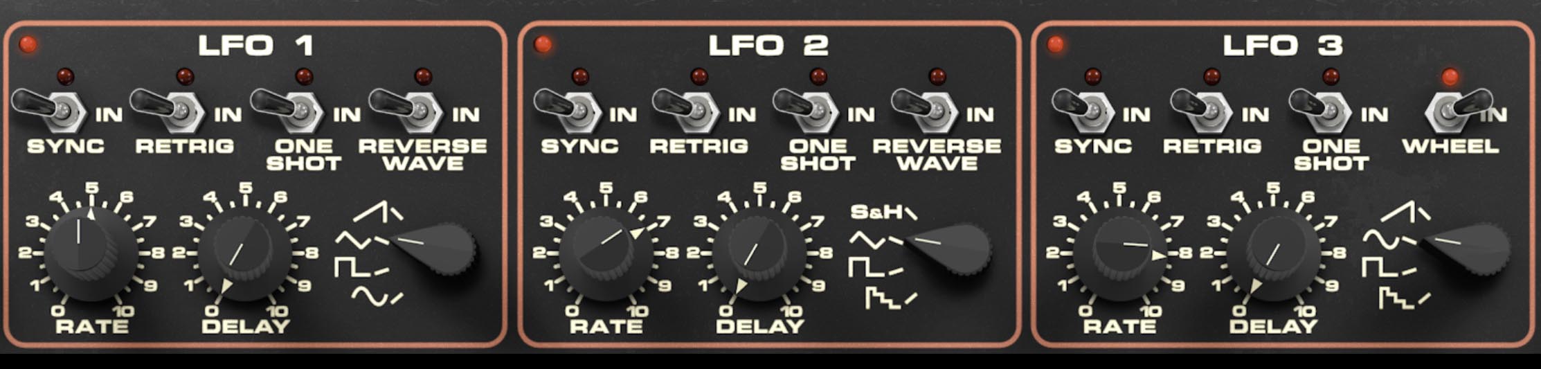 Each LFO includes Rate, Delay, waveform selection, and four switches: Sync, Retrig, One Shot, and a fourth mode switch that differs slightly depending on the LFO. On LFO 1 and LFO 2, that fourth switch is Reverse Wave. On LFO 3, it becomes Wheel.