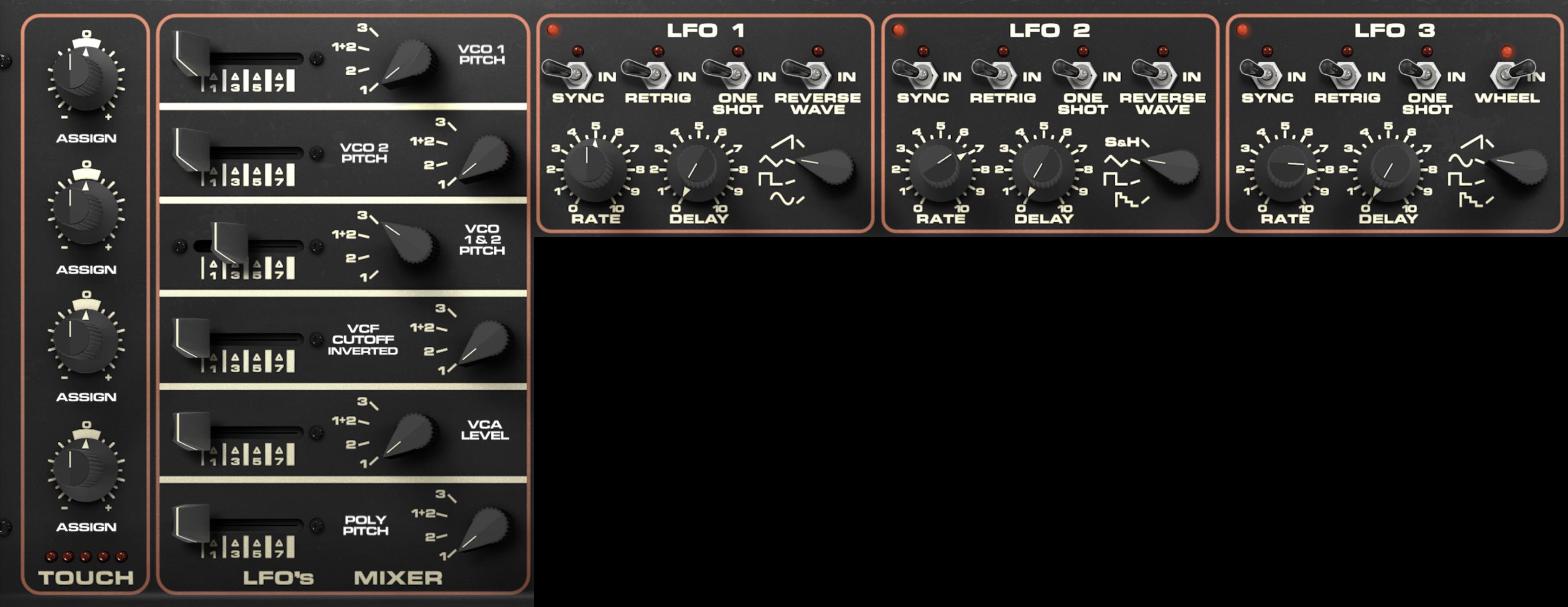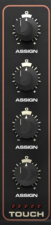 The Touch section gives you four assignable aftertouch slots, each with a bipolar amount knob labeled Assign. Like the LFO Mixer, the destination is chosen by clicking the Assign label and selecting a destination from the same dropdown menu.