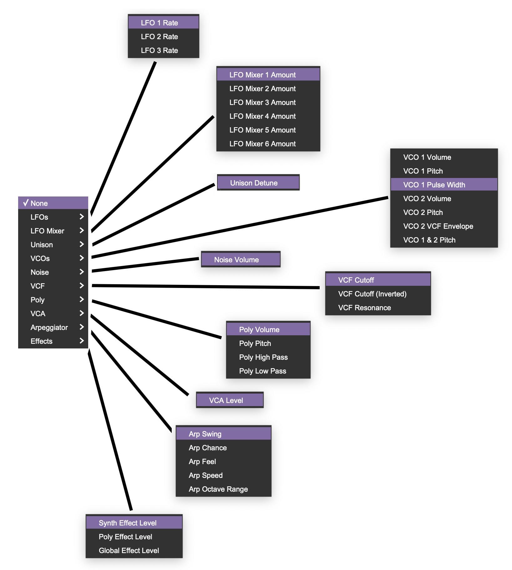 So the signal flow is simple once you know the layout: the slider sets how much, the center label chooses where, and the right-hand knob chooses which LFO gets sent there. This is also an important detail, because the destination is not selected with the knob. The knob only selects the modulation source. The destination is chosen by clicking the slot’s text label.