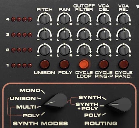 If you want animated repeated-note variation, use Multi mode with Cycle Loop or Cycle Rand., then introduce small offsets in Pitch, Pan, and Cutoff Filter.