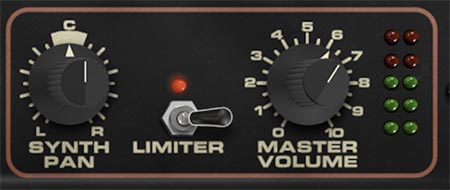 The Limiter switch turns the output limiter on or off. Its job is to help control peaks and keep louder patches from getting too unruly at the final output stage. This is especially useful with stacked Unison sounds, heavily modulated patches, bold effects settings, or anything else likely to produce sudden level jumps.