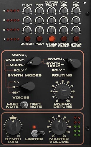Again, note that that the trimmers of rows 2-4 are offset controls, not absolute replacements for the main panel settings, including Synth Pan in the panel at the bottom right.