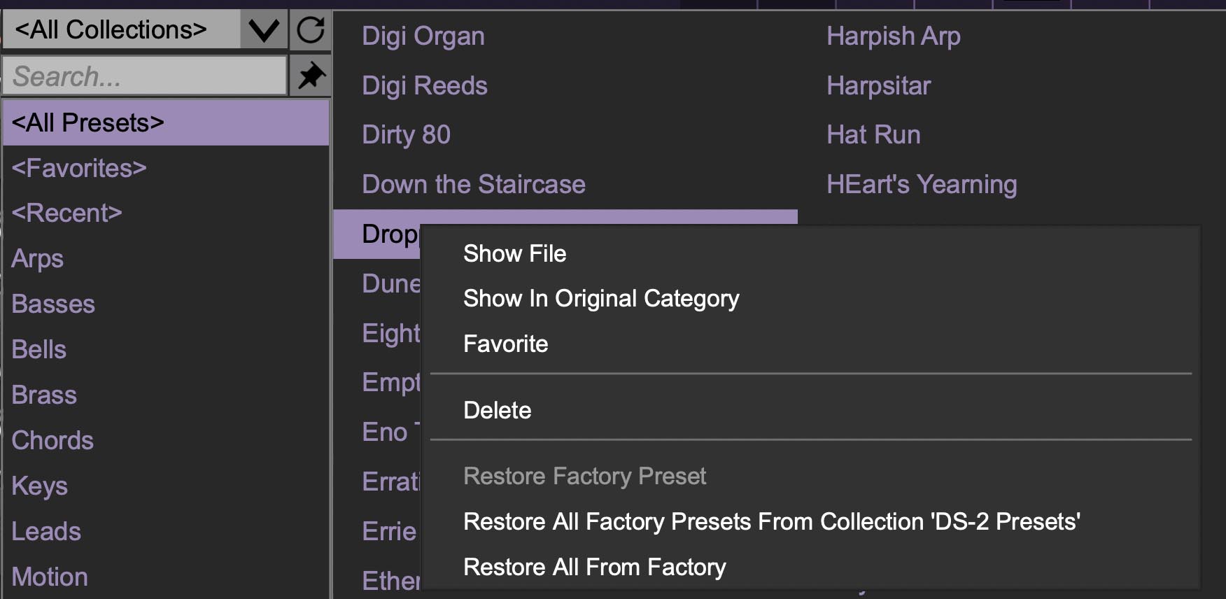 Restore All Factory Presets From 'DS-2 Presets' - If any patches from the "factory" DS-2 bank are edited and saved, selecting this command restores all of them to their unaltered "factory" setting.