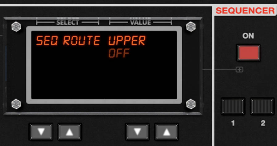 On – Activates or deactivates the sequencer. When ON is active, the display allows you to set the Sequencer Route parameter. If you choose UPPER or LOWER, the Sequencer behaves normally and plays back any notes or chords you’ve recorded. If you choose OFF, the Sequencer won’t trigger audible notes at all, and instead lets you use its stored patterns purely as a modulation source in the Mod Matrix without hearing the sequence play. Note that the Mod Matrix allows you to choose either "Sequencer Lowest Note CV" or "Sequencer Highest Note CV" so that if you have recorded a chord on a sequence step, you can choose to use either the highest note or lowest note of the chord as the modulation value for that step.
