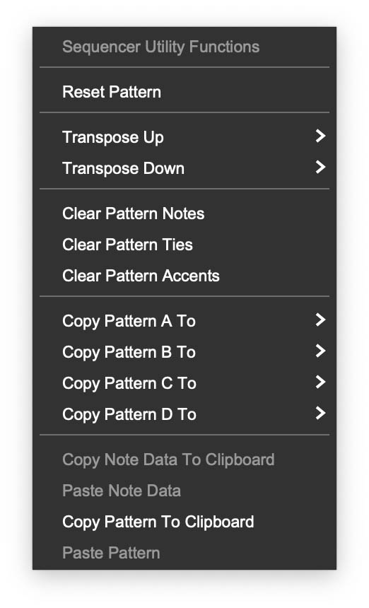 In addition to hands-on editing, the Sequencer features a Utility dropdown menu (click the triangle in the upper-right corner of the Sequencer panel) with a set of utilities for managing your patterns quickly.