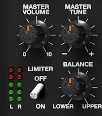 The Master Section controls Mercury-8’s overall output level, global tuning, layer balance, and output limiting. These parameters affect both the Upper and Lower panels equally unless otherwise noted.