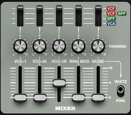 On most synths, the mixer would be the part you set once then mostly ignore. But on SH-MAX, the mixer is where sound design starts, because it doesn’t just mix. It determines what each sound source becomes. Every one of the five sources (VCO-1, VCO-2A, VCO-2B, Ring Mod, and Noise) has its own level fader, stereo pan control, and a routing switch that chooses what signal path that source will travel through.