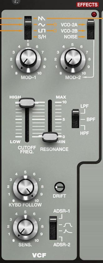 These set how strongly the selected modulation sources affect the cutoff (and possibly other VCF behavior depending on implementation). The key point for programming is that you have two modulation inputs, each with an amount control, so you can combine a musical modulator (like an LFO) with something more brash (like Noise, or VC0-2A or VCO-2B ) without forcing everything through one lane.