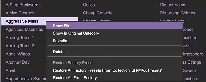 Collection- This is the top level of organization, and contains entire “sets” of presets. The SH-MAX Presets are the main included collection. We also include a User Presets Collection for storing your own presets, but you’re free to create your own collections. To create a new collections, click in the Collection text field (where it says User Presets above) and type a name. User-created sounds can be freely saved to any collection; we like to keep ‘em separated for organizational purposes.