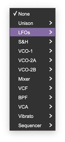 Choose a category (for example: VCF, VCO-2B, Vibrato, Sequencer, etc.).