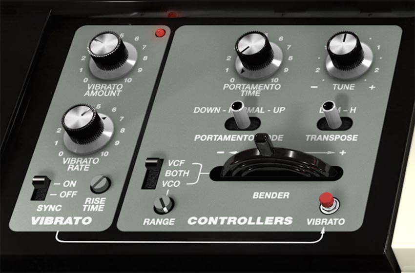 The Vibrato section provides classic LFO-based pitch modulation, with a musical “delay” so vibrato can fade in after the attack instead of starting immediately.