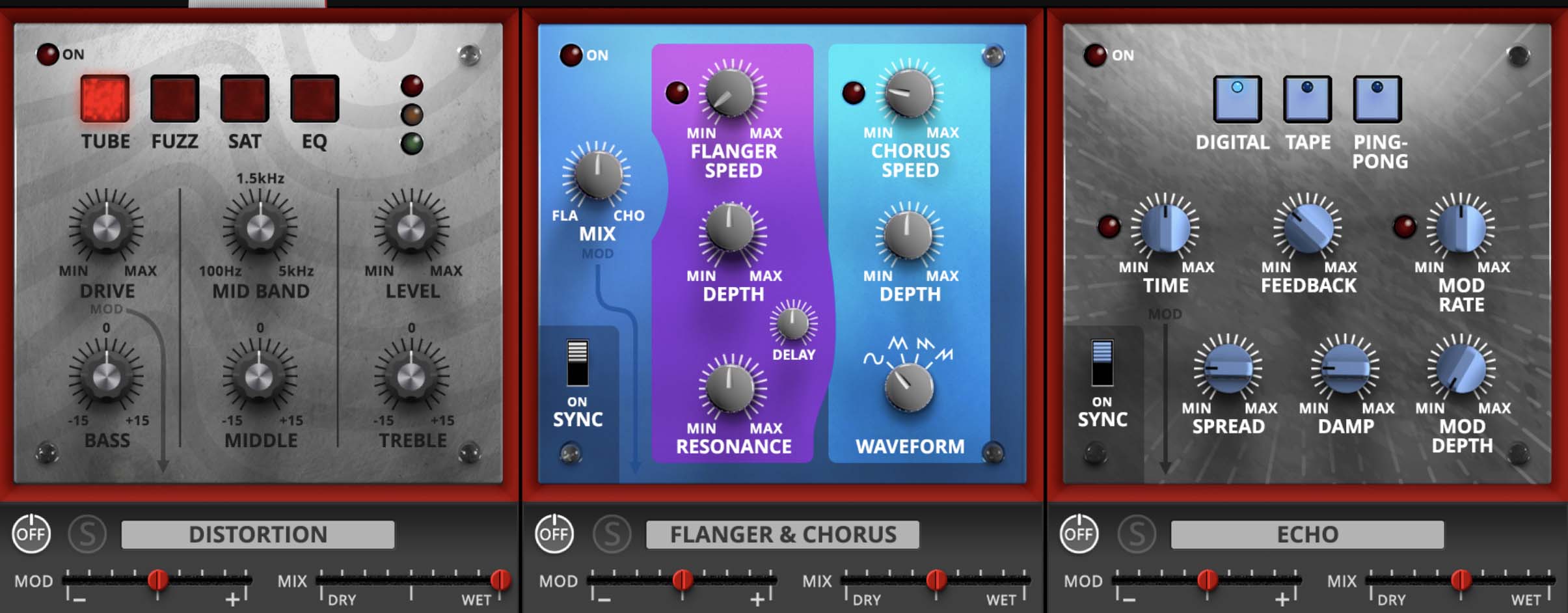 Drive – Amount of gain/saturation (active in Tube, Fuzz, and Sat modes). This can be controlled by the Effect Modulator.
