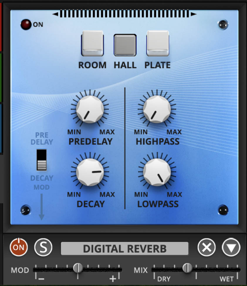 Mod Routing Switch – Chooses whether modulation affects Predelay or Decay.