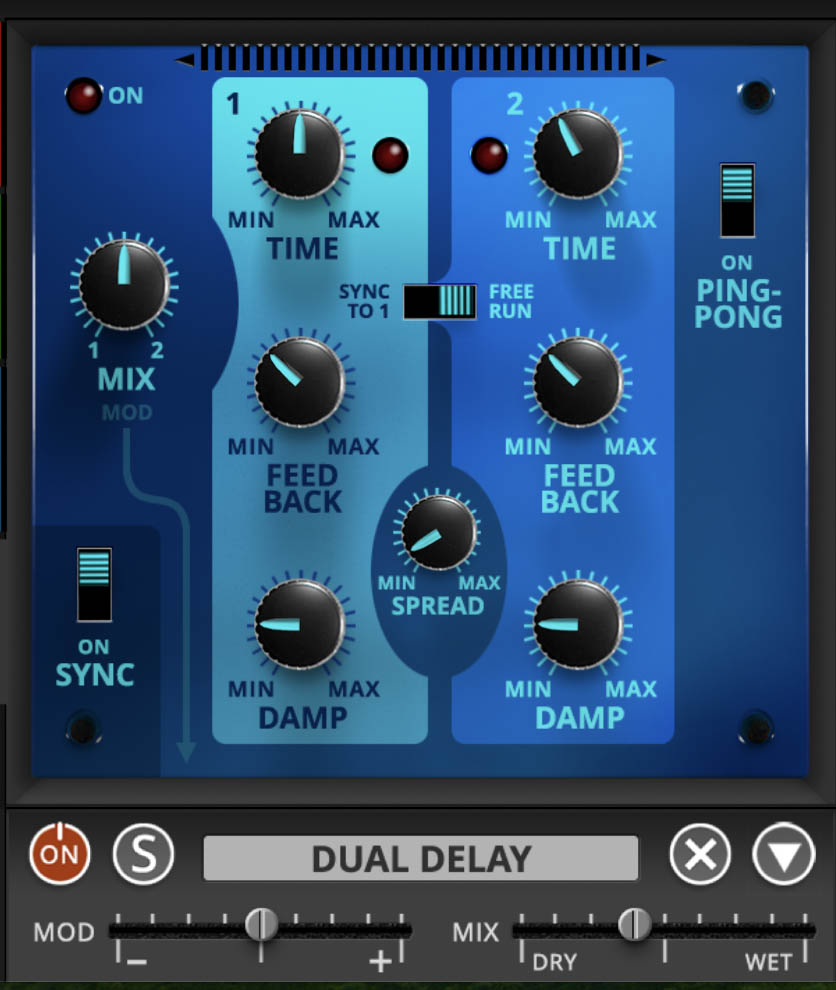 Spread – Adjusts stereo spacing of the delays. Low = centered echoes; high = wide, panned echoes.