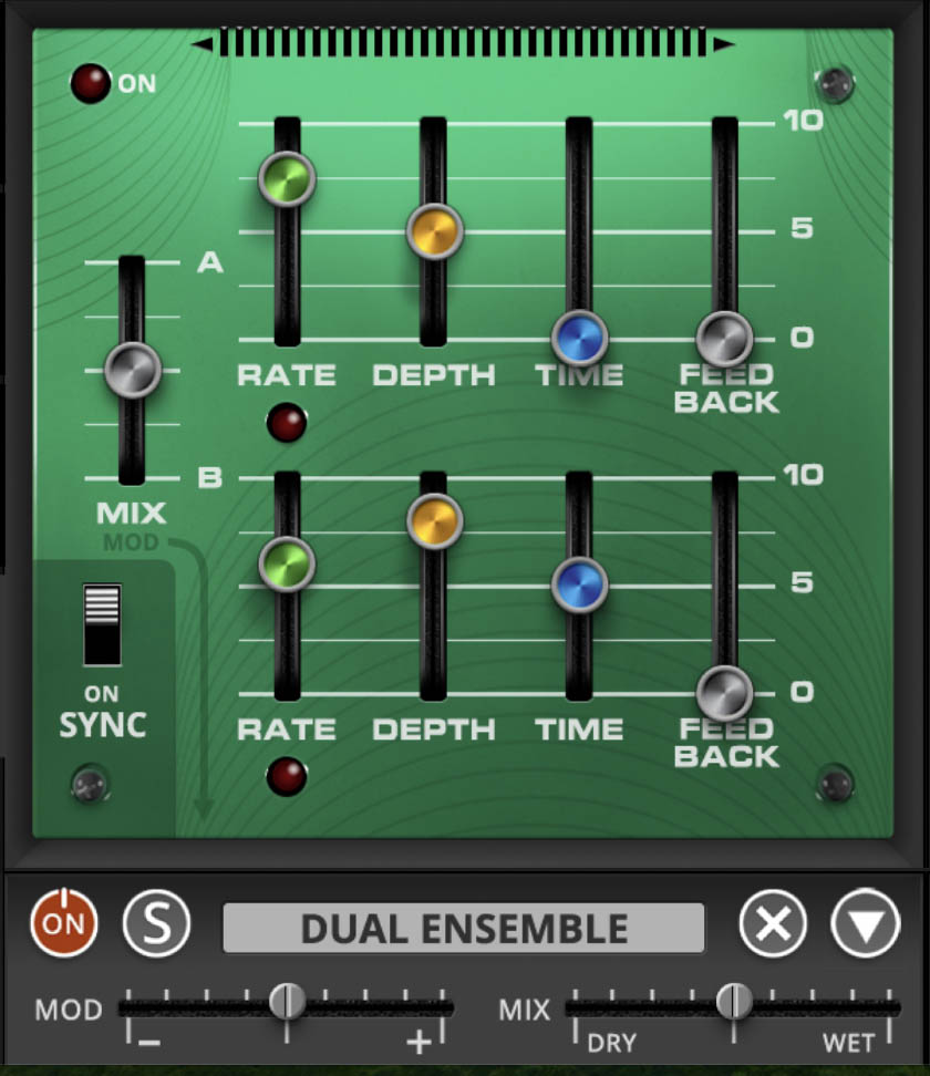 Mix – Balances between Ensemble A and Ensemble B. Use it to layer two different modulation speeds and depths for a rich, evolving chorus.