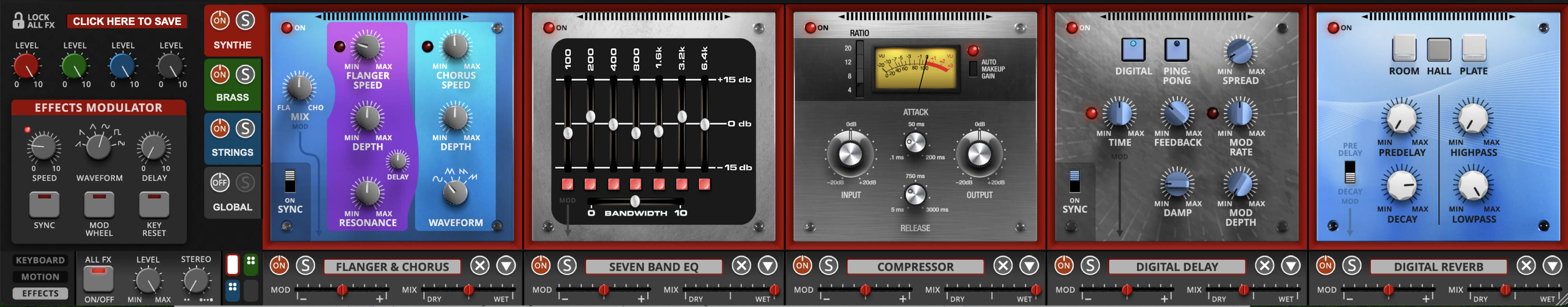 Click the color, build your chain, and get creative. Each section’s chain is fully independent, so yes, you can have phasers on Strings, tape echo on Brass, and distortion on the Synthesizer, all at once.