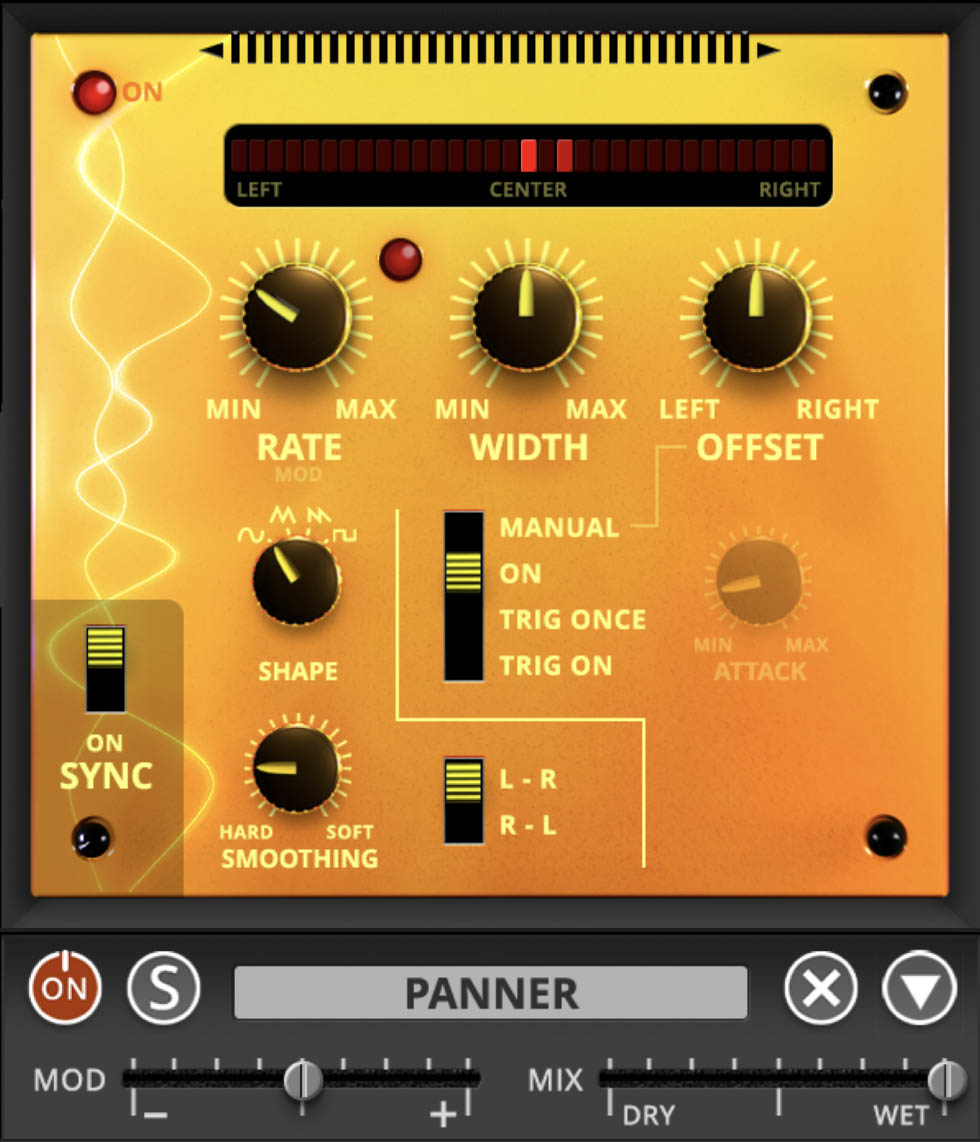 Rate (Min → Max) – Sets the speed of the movement across the stereo field. Lower settings slow down the pan sweep; higher settings make the motion rapid and rhythmic.