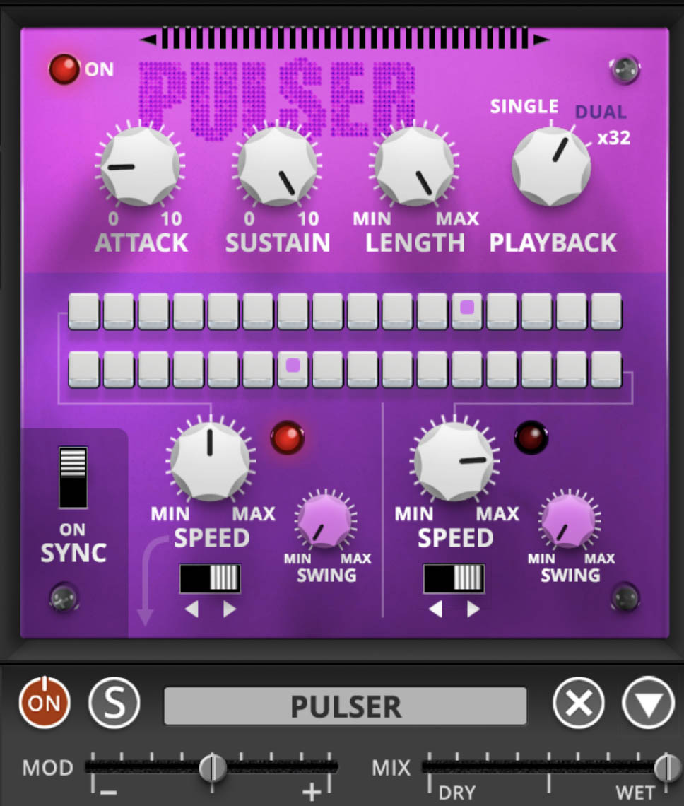 The Pulser effect is a flexible 16-/32-step gate/sequencer built to inject rhythmic motion into sustained sounds or static patches. Think of it as a live, programmable tremolo, stutter or step-gate engine that sits on the end of your signal chain and chops or paces your synth voice, turning pads, leads or drones into patterns that rhythmically pulsate with life.