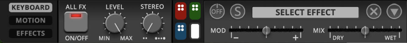 At the bottom of the panel you’ll see four colored squares. These pick which section’s effects chain you’re editing: