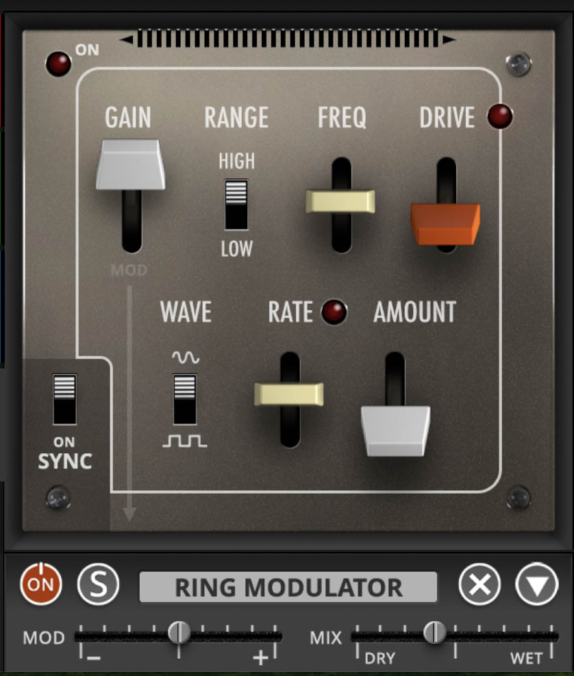 Tip: For classic sci-fi “flying saucer” tones, set Range to High, pick a sine wave, and crank Freq into the audio range. For more musical use, try Low range with Rate synced to tempo and it becomes a tempo-locked tremolo that adds groove without going completely alien.