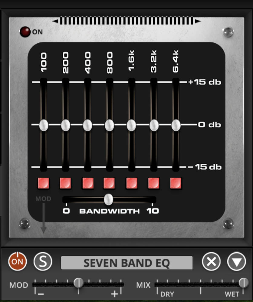 Frequency Bands (100, 200, 400, 800, 1.6k, 3.2k, 6.4k Hz) – Each vertical slider boosts or cuts its band by up to ±15 dB. Push up to emphasize, pull down to reduce.