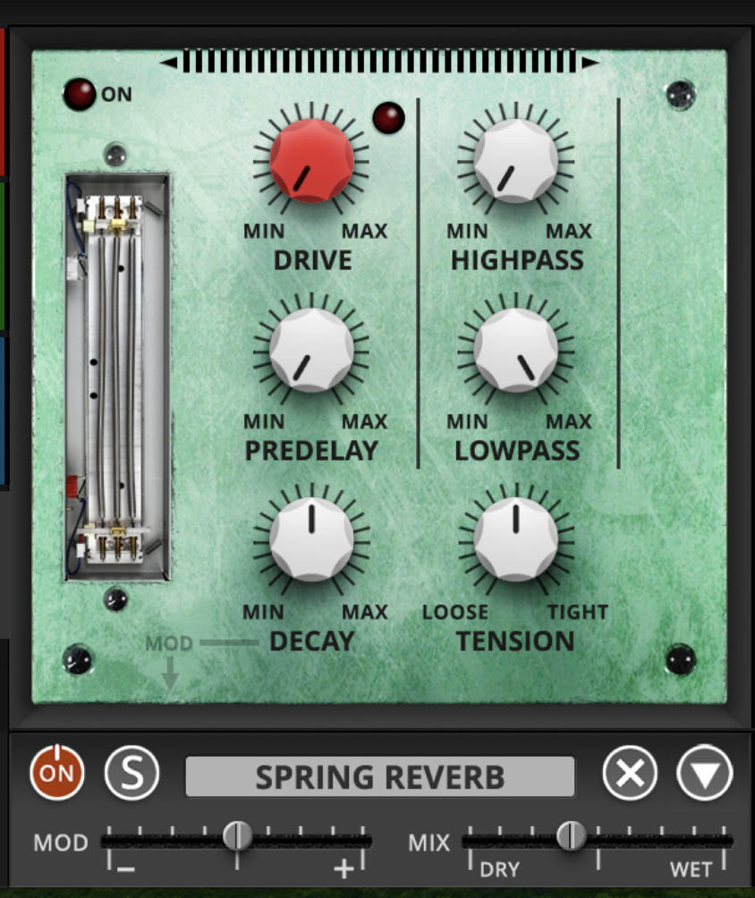 Drive – Pushes the input signal into the springs. Higher settings increase saturation and grit, adding vintage bite to the reverb.