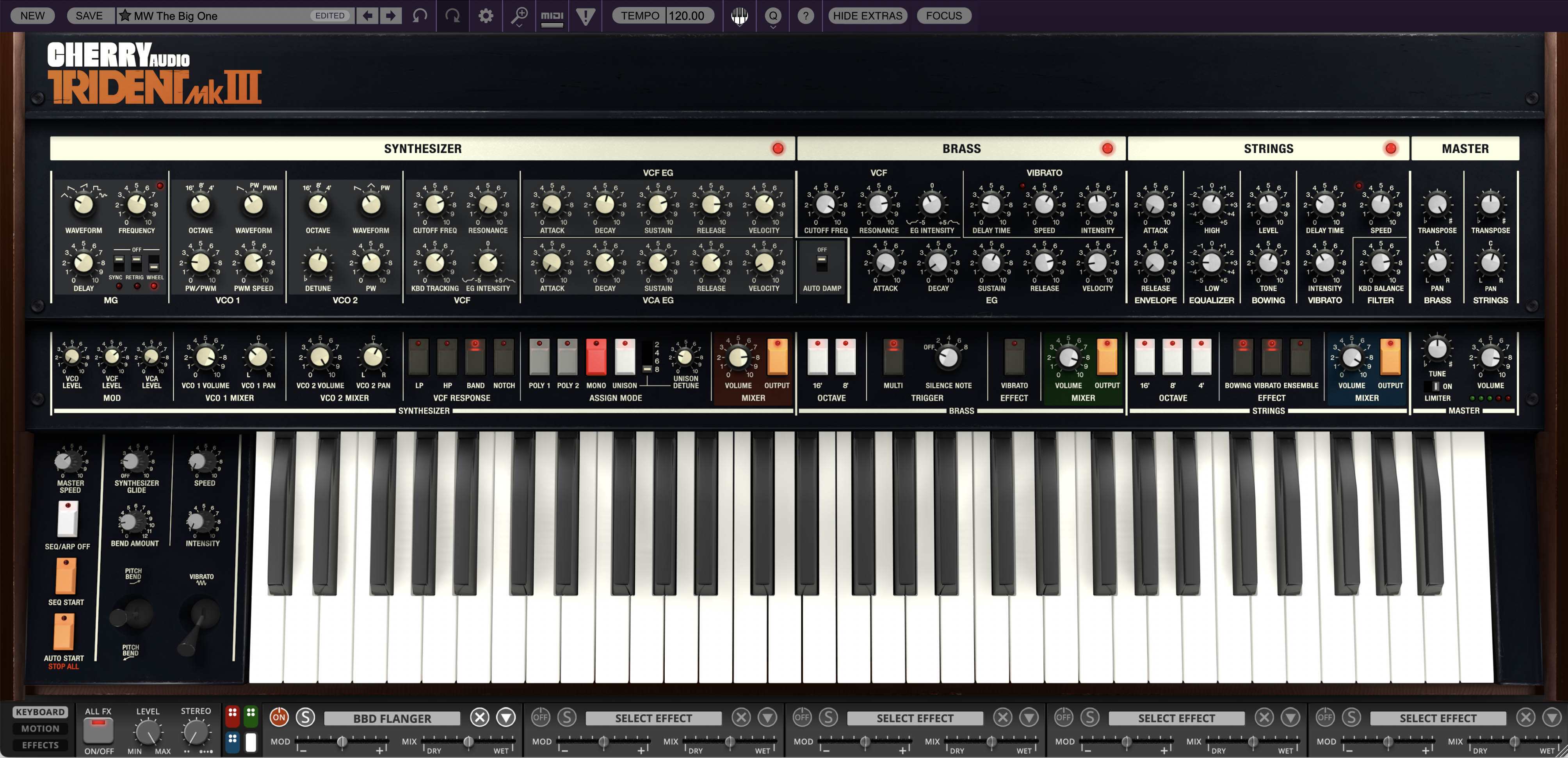 Each of Trident’s three sections provides 16-voice polyphony. In practical terms, you can trigger 16 discrete synth voices, 16 brass voices, and 16 string voices simultaneously without note stealing. The Synthesizer section is implemented as true polyphony, with a complete signal path (including a dedicated filter) allocated per voice. The Brass and Strings, however, retain the paraphonic structure of the original hardware: multiple oscillators feed into a single shared filter and envelope stage, creating the cohesive, ensemble-like response that defines their character.