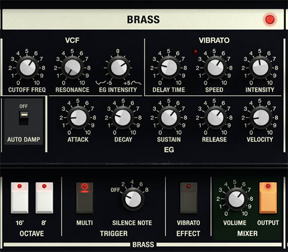 Finally, the Brass section has its own Volume knob and On/Off switch, letting you blend it against the Synthesizer and Strings sections or drop it out entirely.